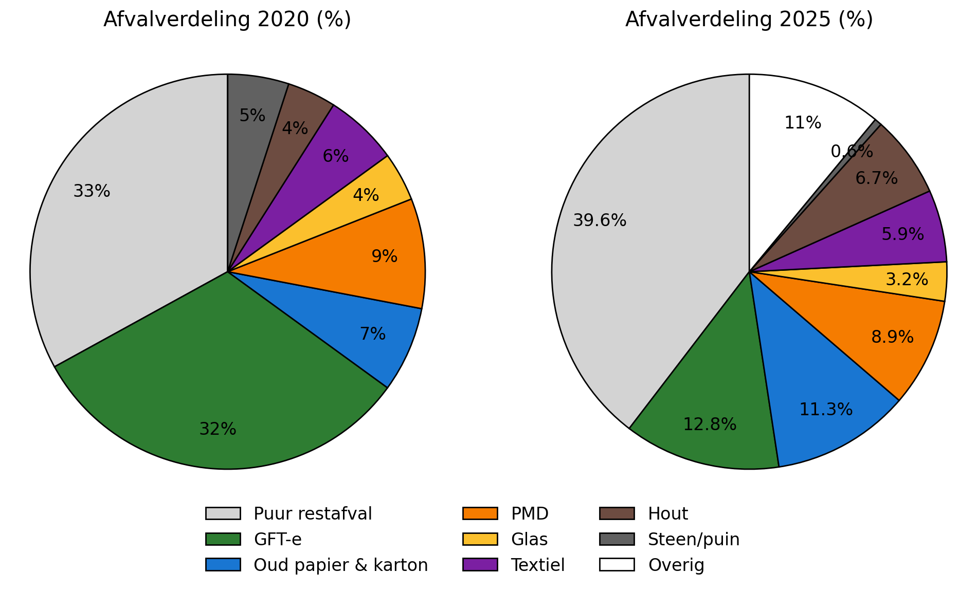 In de cirkeldiagrammen ziet u dat dit aandeel de afgelopen jaren iets is veranderd. In 2020 was 33% uit de vuilniszak echt restafval. In 2025 is dat bijna 40%. Dat is een goede verbetering.